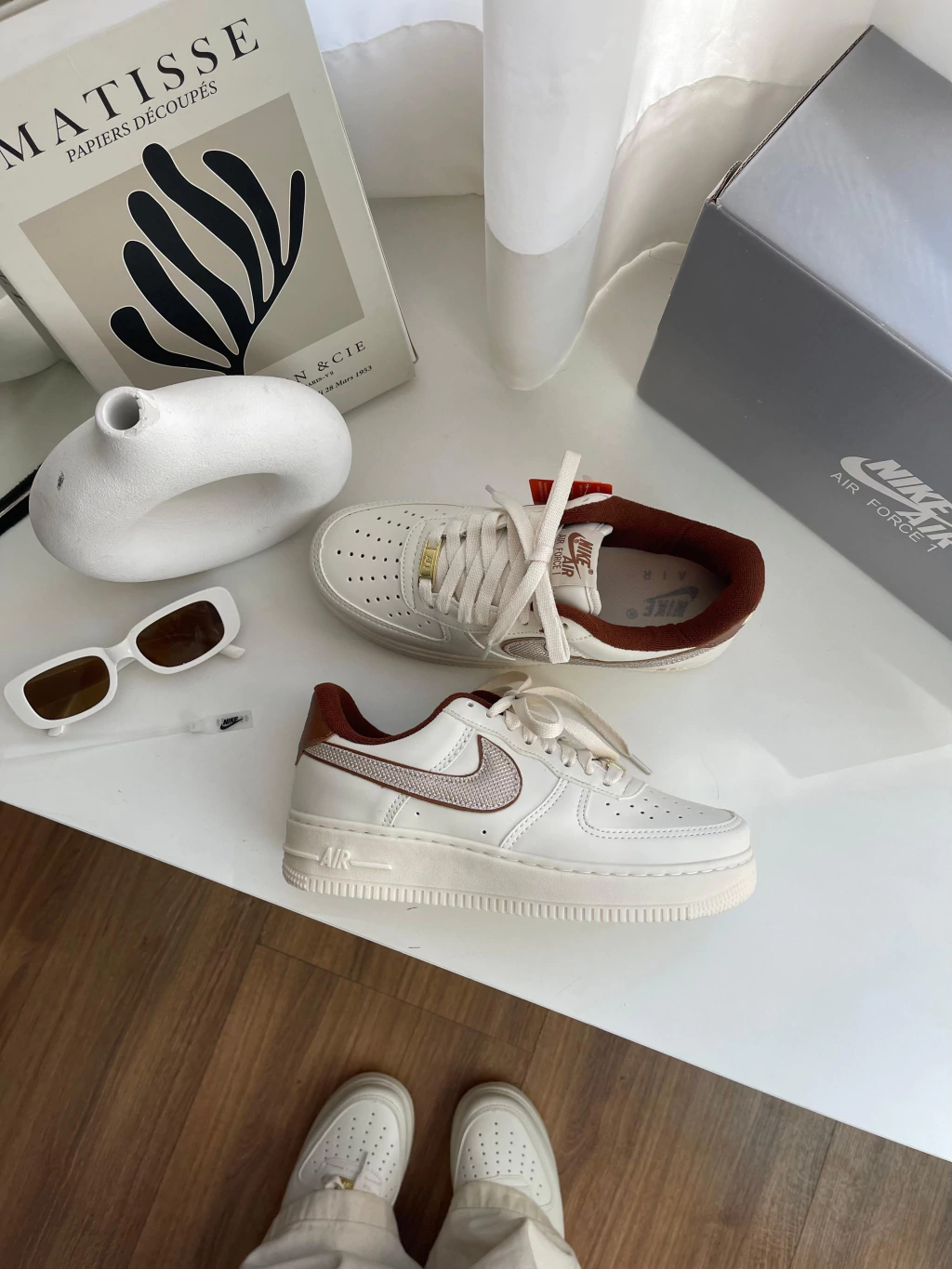 ✔️ Inspirado no icônico Air Force 1, seu design repaginado traz detalhes caramelo que destacam qualquer look. ✔️ O cabedal em material sintético premium garante durabilidade e um acabamento impecável. ✔️ Interior forrado e acolchoado para que seus pés desfrutem de máximo conforto o dia todo. ✔️ Solado robusto com ótima aderência, ideal para o uso diário com segurança e estabilidade. ✔️ Swoosh com textura diferenciada que dá um charme único ao modelo. ✔️ Forma padrão – basta escolher seu número habitual e aproveitar!