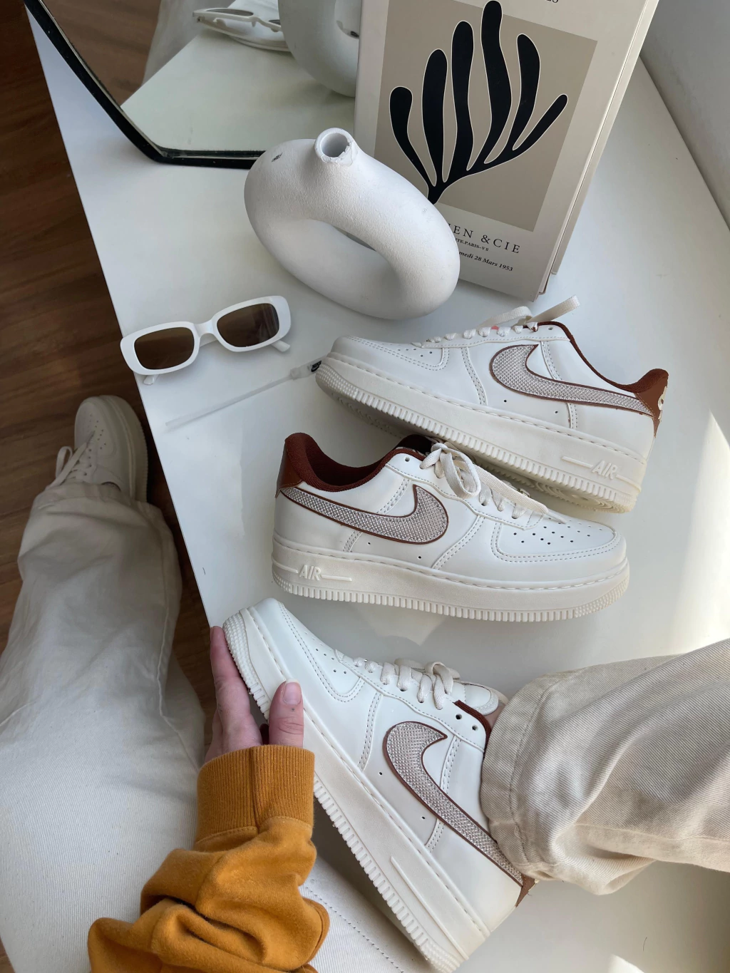 Seja para um passeio casual, um encontro com amigos ou até um evento mais descontraído, o Tênis Air Force 1 Branco com Detalhes Caramelo é a escolha certa para elevar seu visual com personalidade.